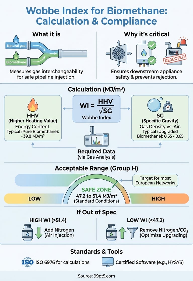 You calculate the Wobbe Index by dividing your higher heating value by the square root of your gas's specific gravity. This single parameter determines whether your biomethane can enter existing pipeline infrastructure without causing equipment problems downstream. Your calculated value must fall within the 47.2 to 51.4 MJ/m³ range for Group H gas specifications that govern most European networks.