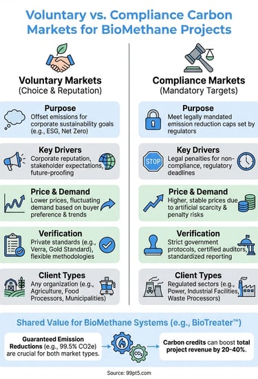 Learn the practical differences between voluntary vs compliance carbon markets. Discover how to identify which market applies to your BioMethane projects & maximize carbon credit revenue.