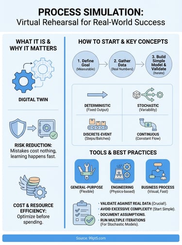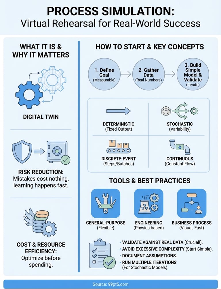 Understand what is process simulation. Test changes virtually to cut risks, save costs, and optimize operations. Explore types, tools, and real-world applications.