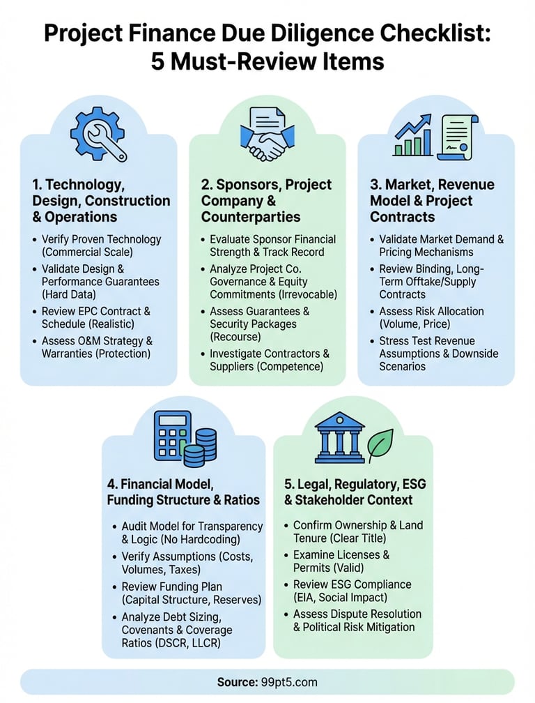 A comprehensive project finance due diligence checklist must address five critical dimensions: technology maturity and construction risk, sponsor strength and counterparty quality, market fundamentals and contract structure, financial model integrity and debt sizing, plus legal compliance and ESG standards. You cannot afford to skip any category or rely on superficial reviews when lenders demand certainty before committing capital to infrastructure projects.