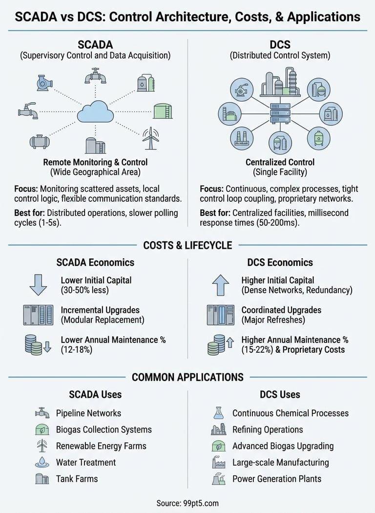 This guide breaks down what separates SCADA from DCS in practical terms. You will learn how each system handles control logic, where companies typically deploy them, what they cost over their lifecycle, and which technical characteristics matter most when you are selecting one for your biogas processing plant or other industrial operation. We focus on real cost drivers and performance guarantees that affect your bottom line, not vague industry generalities.