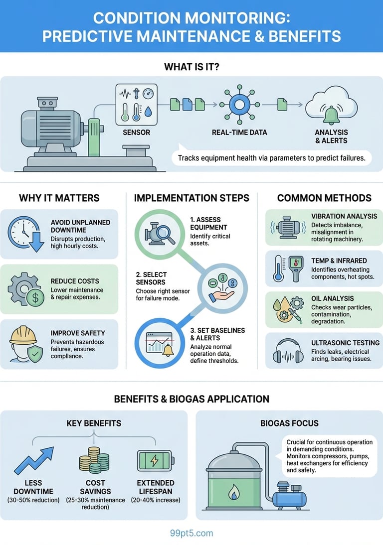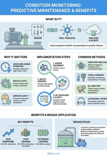 Master what is condition monitoring: methods, sensors, and benefits. Prevent costly downtime, optimize equipment health, and boost ROI for biogas plants.
